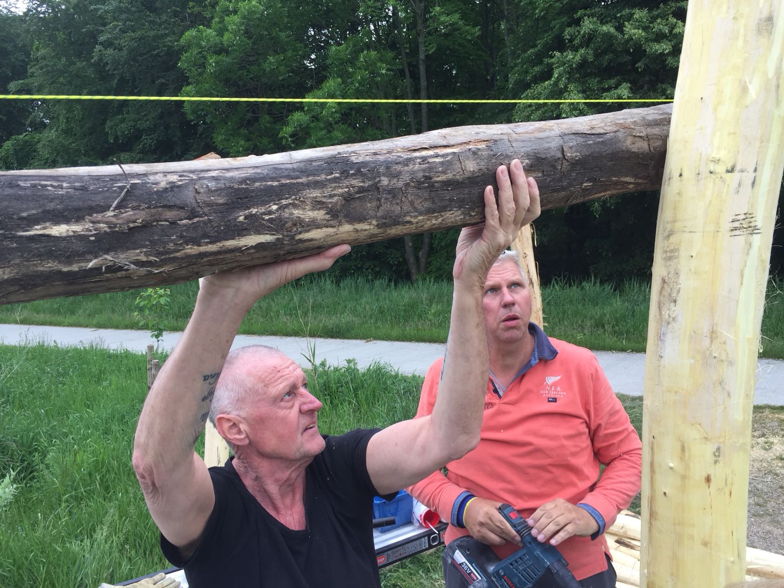 Maud, Harry, Ate, Ben en Ingrid bouwen deze prachtige pergola in het voedselbos. De bedoeling is dat hier straks druiven tegenaan groeien. Wil je nog meehelpen, er is koffie!